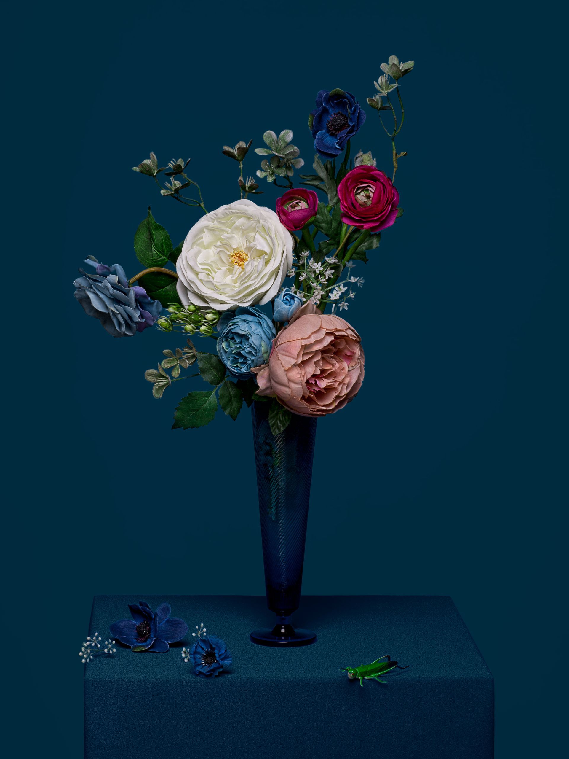 Flowers in a Vase with Grasshopper is onderdeel van mijn lopende project Preserved, bestaande uit recreaties van bloemstillevens uit verschillende stijlperiodes in de kunst. Het materiaal bestaat uitsluitend uit artificiële bloemen en rekwisieten afkomstig uit de kringloopwinkel.